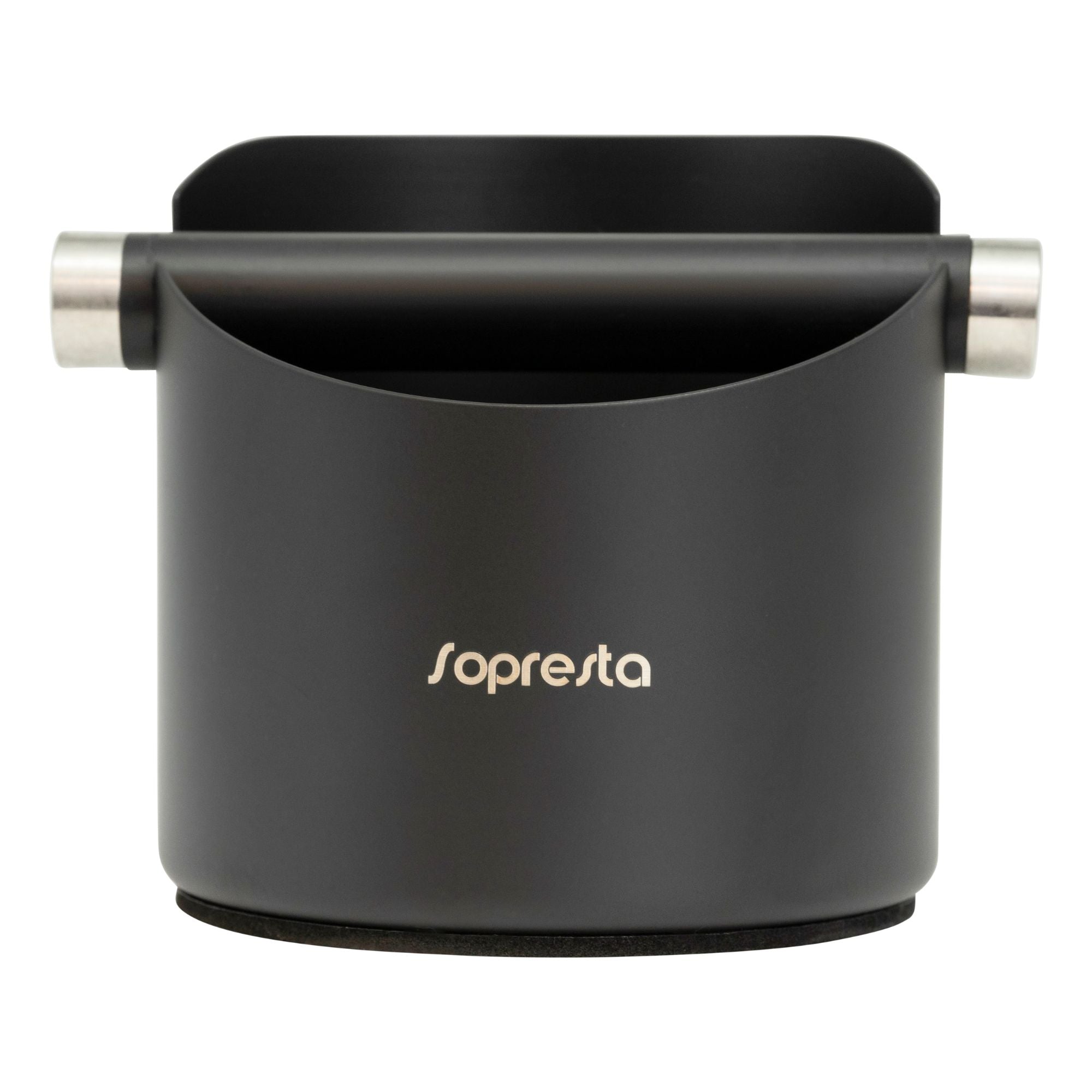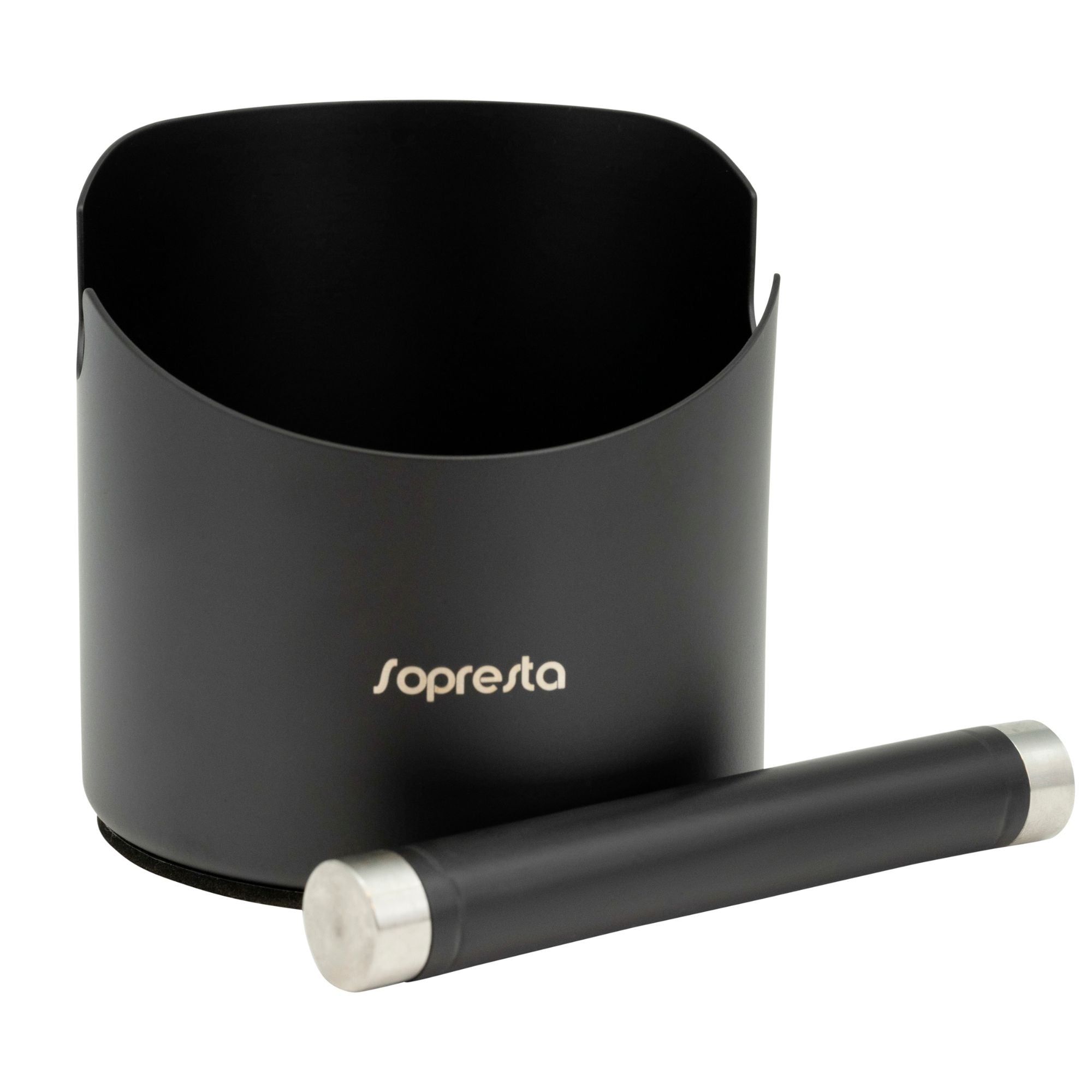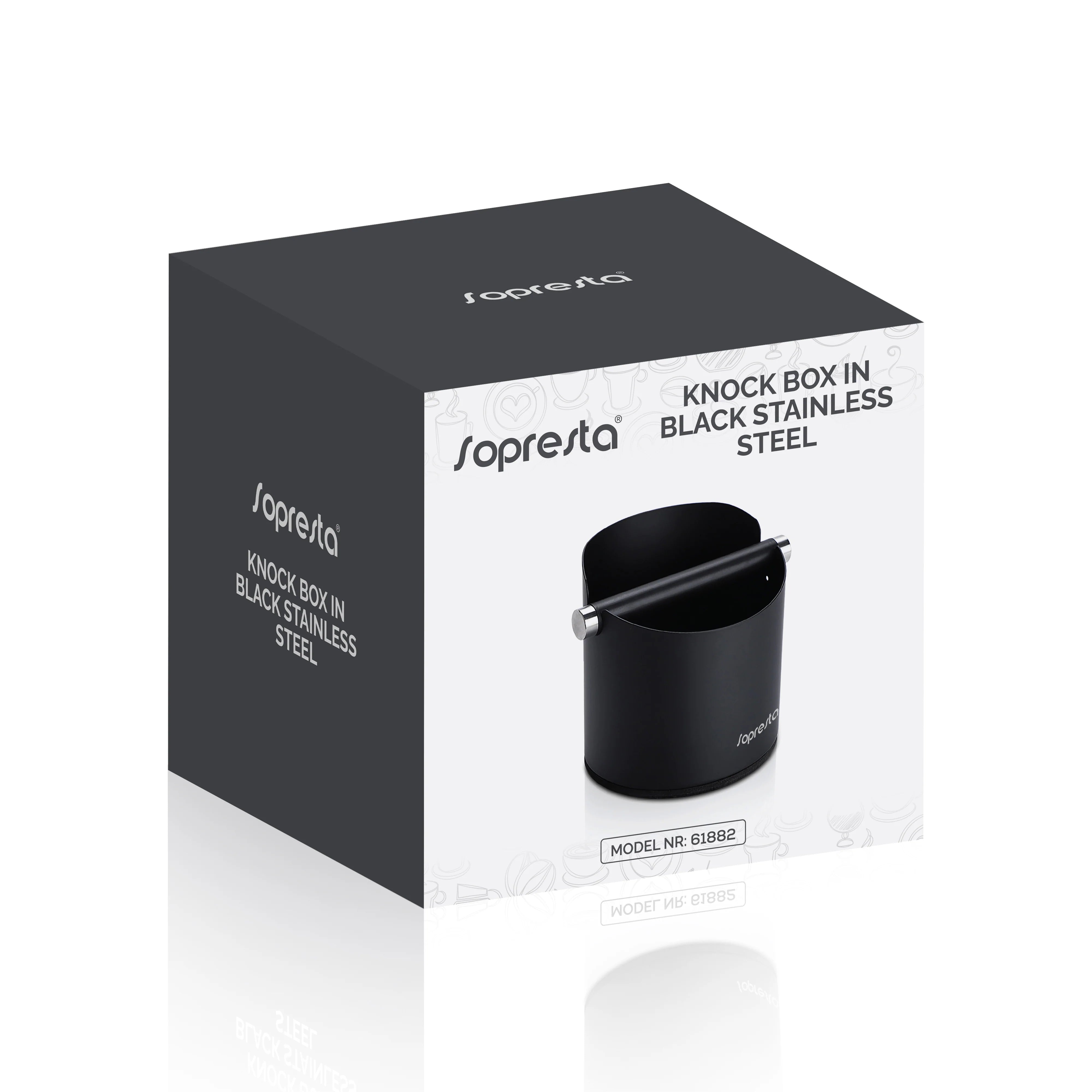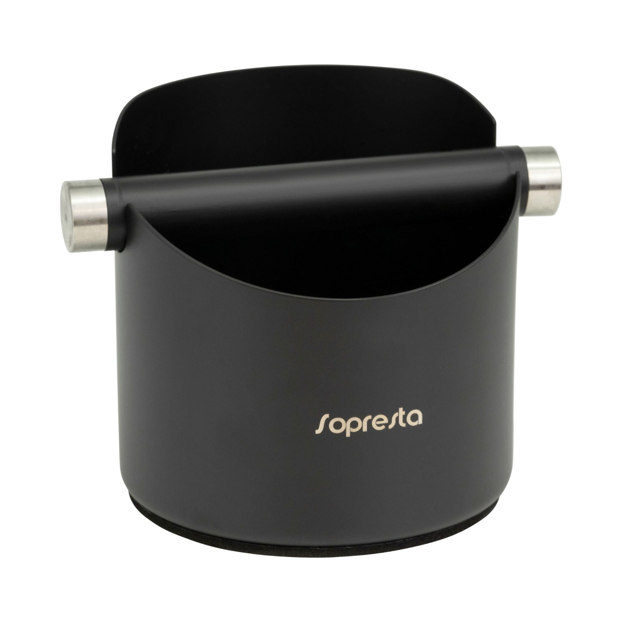 Sopresta Knockbox i svart rostfritt stål är en behållare för att förvara använda espresso-pucks från en espressomaskin. Den är tillverkad av rostfritt stål och har en svart färg. Knockboxen har en stark stötdämpare som gör det enkelt att skjuta de använda kaffepucksen in i behållaren. Det är en praktisk lösning som gör det lätt att förvara och göra sig av med använda kaffepucks på ett hygieniskt och ordentligt sätt. Knockboxen är också lätt att rengöra och har en attraktiv design som passar in i de flesta kök.