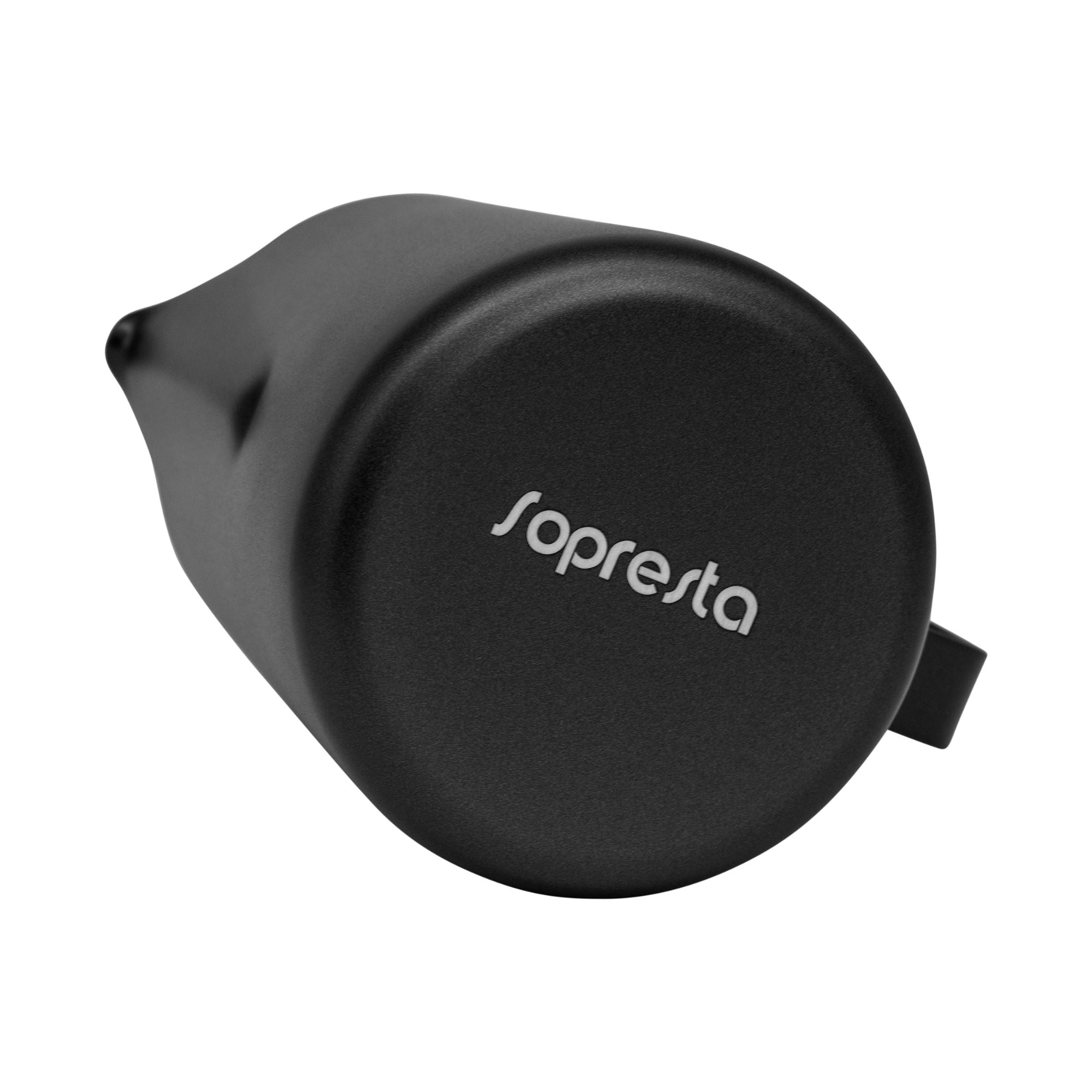 En Sopresta mjölkkanna i svart och rostfritt stål i storleken 600 ml med en hällbar pip är ett praktiskt redskap när du vill skumma mjölk till espresso. Kannan är tillverkad av rostfritt stål, vilket är ett hållbart material som inte rostar eller oxiderar. Det är också lätt att rengöra och motståndskraftigt mot bakterier. Kannan är svart, vilket ger den en elegant och stilren look som passar bra in i de flesta kök.
