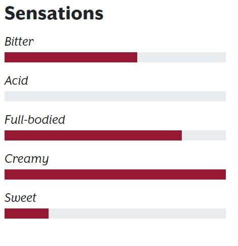 Kaffe med stark smak, krämigt med gyllene nyanser. Rostade aromer. Full.