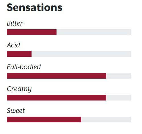 Kräm av mörk hasselfärg, fyllig, balanserad i sina smaker, med söta toner. Full av dofter, behaglig eftersmak. Koffeinhalt under 0,10 %